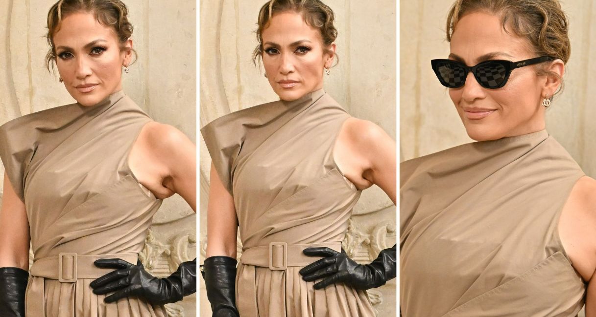 Dopo qualche giorno di relax con amici in Costiera Amalfitana, Jennifer Lopez è volata a Parigi per assistere alla sfilata di Christian Dior Haute Couture, uno degli appuntamenti più attesi della settimana della moda francese. La moglie di Ben Affleck ha sfoggiato un elegante completo marrone chiaro, con cintura, scollo asimmetrico e gonna a trapezio. Ha sfidato il caldo di questi giorni aggiungendo all’outfit una giacca abbinata, sandali dorati con tacco alto di Jimmy Choo, lunghi guanti neri, occhiali da sole e la mitica borsa trapuntata di Dior della stessa tonalità.
