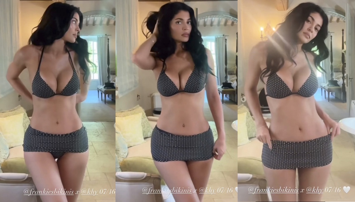 Uno dei trend dominanti della collezione è il motivo a pois, proposto in più varianti e già diventato virale su Instagram. Kylie lo ha indossato anche in casa, in una serie di scatti che la ritraggono davanti allo specchio con il modello Camila, un triangolo classico ma dal taglio preciso, abbinato a una microgonna coordinata in tessuto elasticizzato. Un look da pin-up moderna che mixa sensualità e tenerezza in perfetto stile Frankies Bikinis.
