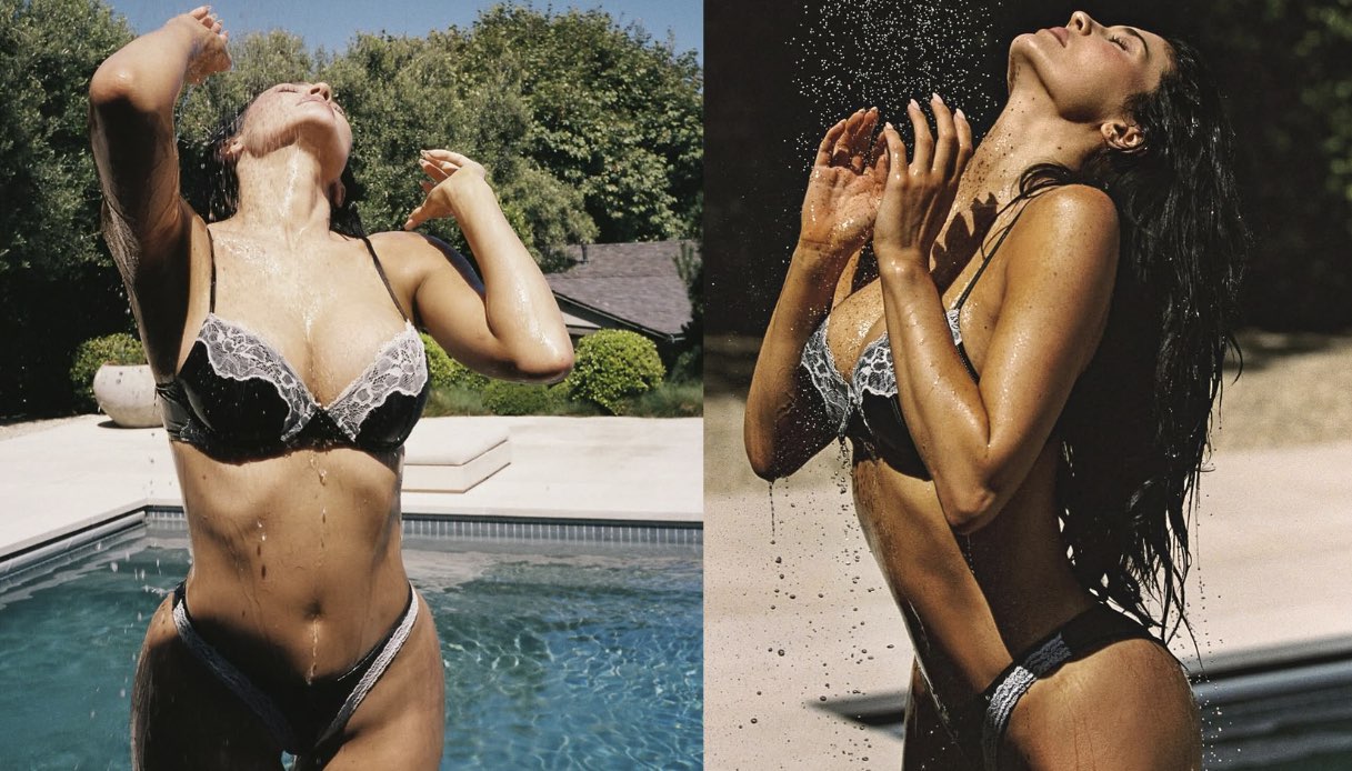 Altro must della capsule è la Lacey Leopard, una stampa animalier scura con base nera e riflessi satinati, che Kylie ha sfoggiato nel giardino di casa con un mood quasi cinematografico. L’acqua della piscina, il controluce e i capelli bagnati creano una narrazione visiva tutta californiana, dove il bikini diventa simbolo di potere femminile, libertà e glamour.