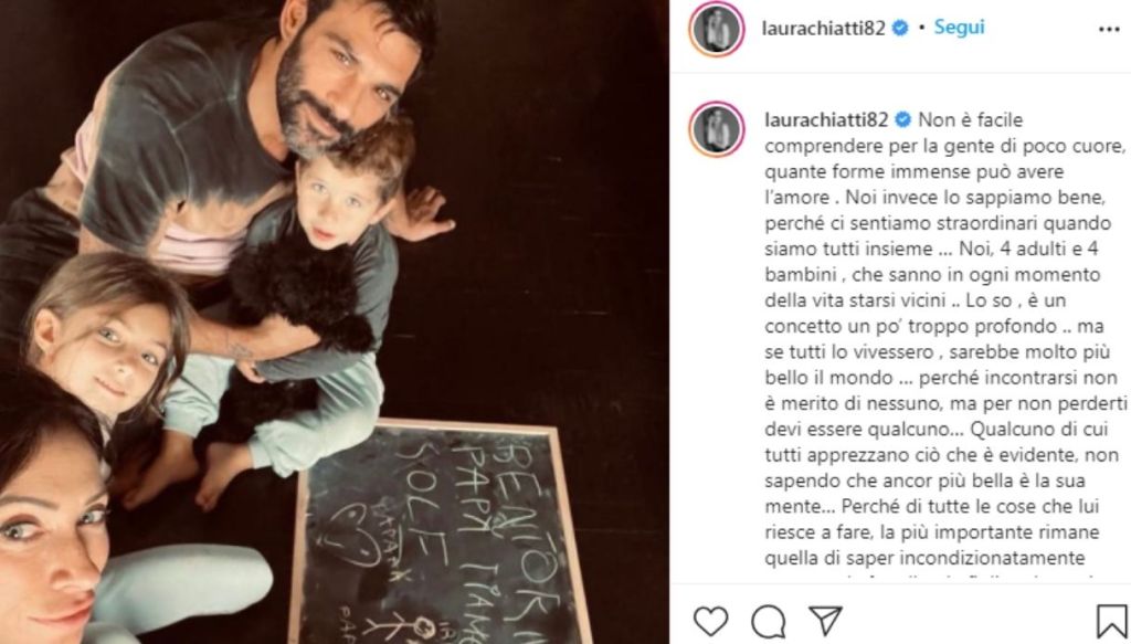 “Non è facile comprendere per la gente di poco cuore quante forme immense può avere l’amore”, così inizia la sua dedica Laura Chiatti. E ancora: “Noi invece lo sappiamo bene, perché ci sentiamo straordinari quando siamo tutti insieme. Noi, quattro adulti e quattro bambini, che sanno in ogni momento della vita starsi vicini”.