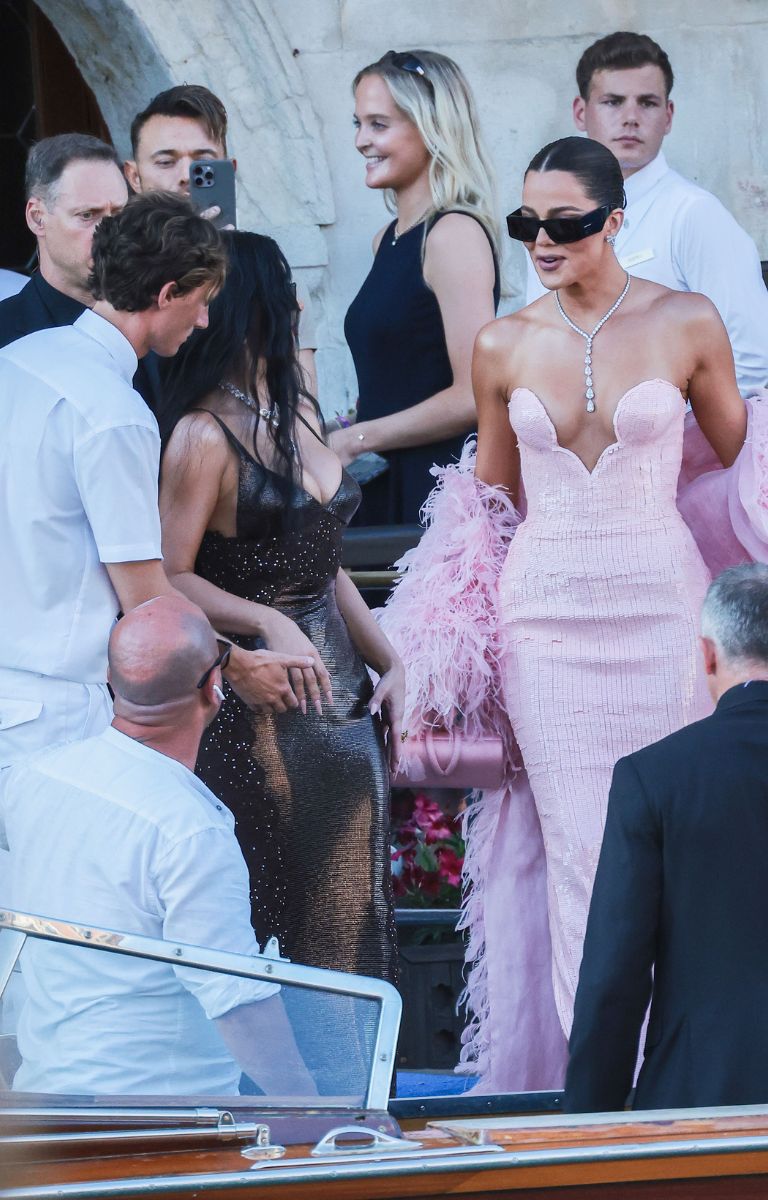 Rubare la scena a Lauren Sanchez, che cambierà ben 27 abiti nel corso dei lunghi festeggiamenti, è impossibile, ma le sorelle Kardashian ci stanno andando vicino. Le più fotografate del Canal Grande sono state Kim e Khloé Kardashian. Le sorelle hanno lasciato il lussuoso albergo per recarsi alla cerimonia nuziale con due outfit degni di una festa del Grande Gatsby. Kim ha puntato tutto sulla sensualità, in total black, da vera femme fatale. I capelli sono portati sciolti e lievemente mossi (ottima scelta considerata l’umidità della laguna). Un abito attillatissimo, scollato, luccicante e lievemente trasparente. Immancabili degli enormi diamanti a incorniciare la scollatura.