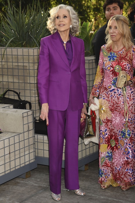 A catalizzare gli sguardi, come sempre, è stata Jane Fonda, che ha indossato un tailleur viola monocromatico dalla precisione sartoriale ipnotica. Il blazer monopetto, con spalle strutturate, revers a lancia e punto vita appena segnato, è stato indossato sopra una camicia ton sur ton, abbottonata fino al collo per creare un effetto uniforme e autorevole. I pantaloni a gamba dritta, con piega centrale perfetta, sfioravano appena la punta dei sandali silver con cinturino a gabbia, vero dettaglio ricorrente nel guardaroba recente dell’attrice.