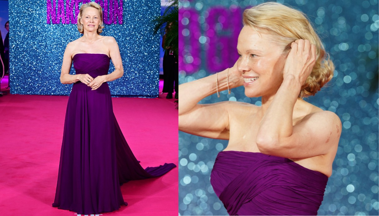 Pamela Anderson ha incantato tutti con un’eleganza sobria ma carismatica, scegliendo un abito couture firmato Rodarte, uno dei brand più amati dalle celebrity in cerca di un’eleganza fuori dagli schemi. Il modello scelto per l’anteprima londinese è una creazione su misura color viola imperiale, con corpetto drappeggiato che esalta la silhouette e una gonna fluida e leggera che accarezza il tappeto con grazia.