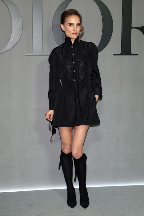 Per il front row della sfilata di Dior, Portman ha scelto un abito mini a maniche lunghe in taffetà nero, con pannelli di pizzo trasparente sul davanti e spalle strutturate che aggiungevano un tocco di drammaticità.