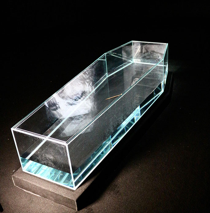 I i visitatori si trovano trasportati nel silenzio assordante degli abissi attraverso un allestimento intenso e coinvolgente: una grande bara di vetro contenente acqua di mare, simbolo inequivocabile della vulnerabilità degli ecosistemi acquatici e della vita stessa, è posizionata al centro di 12 grandi immagini poste su una parete nera trafitte da chiodi di ferro grezzo.